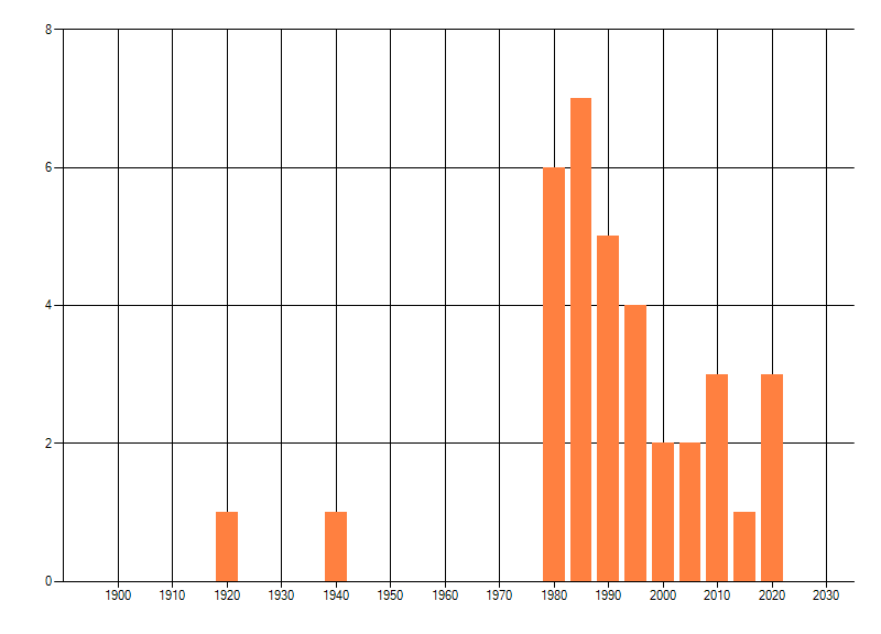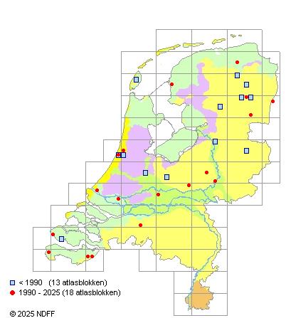 Het aantal atlasblokken (5x5 km) waarin de soort is gemeld binnen een periode van vijf jaar (vanaf 1980) of twintig jaar. Niet gecorrigeerd voor waarnemersinspanning en het aantal doorgegeven waarnemingen kan sterk variëren per periode, dus een trend in verspreiding kan hier niet direct uit worden afgelezen. Het opgegeven jaartal is het eerste jaar van de periode. Bron: gevalideerde waarnemingen uit de NDFF.