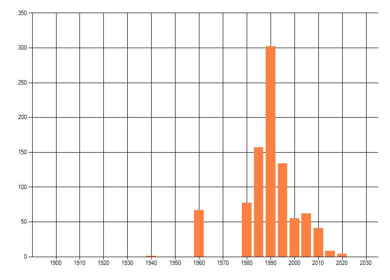 Het aantal atlasblokken (5x5 km) waarin de soort is gemeld binnen een periode van vijf jaar (vanaf 1980) of twintig jaar. Niet gecorrigeerd voor waarnemersinspanning en het aantal doorgegeven waarnemingen kan sterk variëren per periode, dus een trend in verspreiding kan hier niet direct uit worden afgelezen. Het opgegeven jaartal is het eerste jaar van de periode. Bron: gevalideerde waarnemingen uit de NDFF.