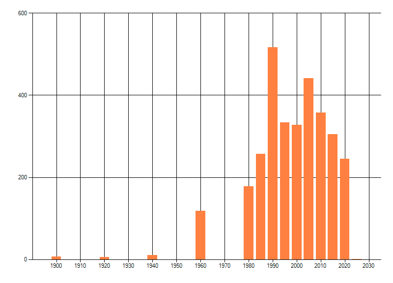 Het aantal atlasblokken (5x5 km) waarin de soort is gemeld binnen een periode van vijf jaar (vanaf 1980) of twintig jaar. Niet gecorrigeerd voor waarnemersinspanning en het aantal doorgegeven waarnemingen kan sterk variëren per periode, dus een trend in verspreiding kan hier niet direct uit worden afgelezen. Het opgegeven jaartal is het eerste jaar van de periode. Bron: gevalideerde waarnemingen uit de NDFF.