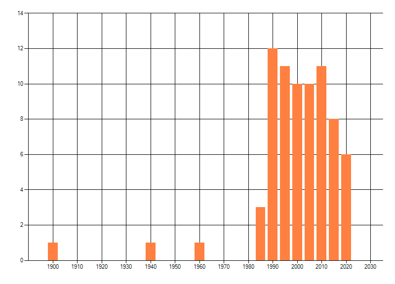 Het aantal atlasblokken (5x5 km) waarin de soort is gemeld binnen een periode van vijf jaar (vanaf 1980) of twintig jaar. Niet gecorrigeerd voor waarnemersinspanning en het aantal doorgegeven waarnemingen kan sterk variëren per periode, dus een trend in verspreiding kan hier niet direct uit worden afgelezen. Het opgegeven jaartal is het eerste jaar van de periode. Bron: gevalideerde waarnemingen uit de NDFF.