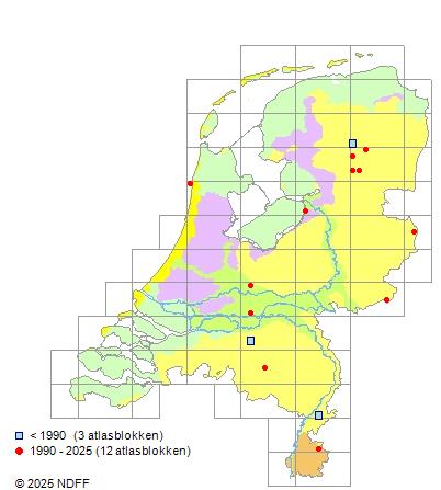 Het aantal atlasblokken (5x5 km) waarin de soort is gemeld binnen een periode van vijf jaar (vanaf 1980) of twintig jaar. Niet gecorrigeerd voor waarnemersinspanning en het aantal doorgegeven waarnemingen kan sterk variëren per periode, dus een trend in verspreiding kan hier niet direct uit worden afgelezen. Het opgegeven jaartal is het eerste jaar van de periode. Bron: gevalideerde waarnemingen uit de NDFF.