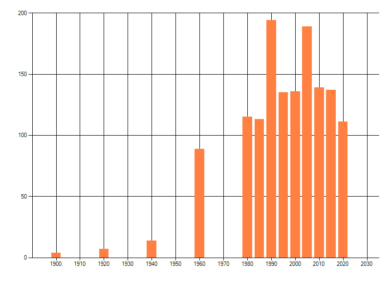 Het aantal atlasblokken (5x5 km) waarin de soort is gemeld binnen een periode van vijf jaar (vanaf 1980) of twintig jaar. Niet gecorrigeerd voor waarnemersinspanning en het aantal doorgegeven waarnemingen kan sterk variëren per periode, dus een trend in verspreiding kan hier niet direct uit worden afgelezen. Het opgegeven jaartal is het eerste jaar van de periode. Bron: gevalideerde waarnemingen uit de NDFF.