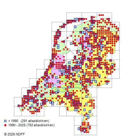 Het aantal atlasblokken (5x5 km) waarin de soort is gemeld binnen een periode van vijf jaar (vanaf 1980) of twintig jaar. Niet gecorrigeerd voor waarnemersinspanning en het aantal doorgegeven waarnemingen kan sterk variëren per periode, dus een trend in verspreiding kan hier niet direct uit worden afgelezen. Het opgegeven jaartal is het eerste jaar van de periode. Bron: gevalideerde waarnemingen uit de NDFF.