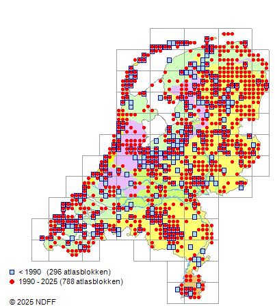 Het aantal atlasblokken (5x5 km) waarin de soort is gemeld binnen een periode van vijf jaar (vanaf 1980) of twintig jaar. Niet gecorrigeerd voor waarnemersinspanning en het aantal doorgegeven waarnemingen kan sterk variëren per periode, dus een trend in verspreiding kan hier niet direct uit worden afgelezen. Het opgegeven jaartal is het eerste jaar van de periode. Bron: gevalideerde waarnemingen uit de NDFF.