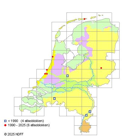 Het aantal atlasblokken (5x5 km) waarin de soort is gemeld binnen een periode van vijf jaar (vanaf 1980) of twintig jaar. Niet gecorrigeerd voor waarnemersinspanning en het aantal doorgegeven waarnemingen kan sterk variëren per periode, dus een trend in verspreiding kan hier niet direct uit worden afgelezen. Het opgegeven jaartal is het eerste jaar van de periode. Bron: gevalideerde waarnemingen uit de NDFF.