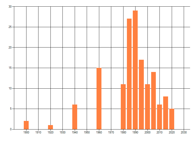 Het aantal atlasblokken (5x5 km) waarin de soort is gemeld binnen een periode van vijf jaar (vanaf 1980) of twintig jaar. Niet gecorrigeerd voor waarnemersinspanning en het aantal doorgegeven waarnemingen kan sterk variëren per periode, dus een trend in verspreiding kan hier niet direct uit worden afgelezen. Het opgegeven jaartal is het eerste jaar van de periode. Bron: gevalideerde waarnemingen uit de NDFF.