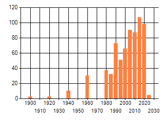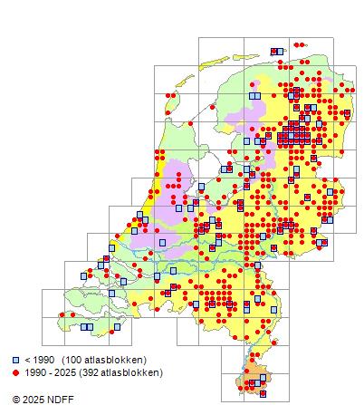 Het aantal atlasblokken (5x5 km) waarin de soort is gemeld binnen een periode van vijf jaar (vanaf 1980) of twintig jaar. Niet gecorrigeerd voor waarnemersinspanning en het aantal doorgegeven waarnemingen kan sterk variëren per periode, dus een trend in verspreiding kan hier niet direct uit worden afgelezen. Het opgegeven jaartal is het eerste jaar van de periode. Bron: gevalideerde waarnemingen uit de NDFF.