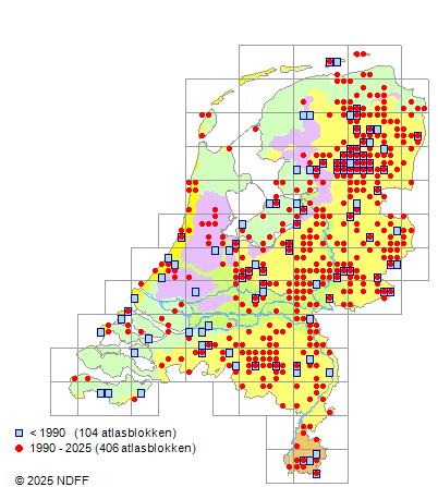 Het aantal atlasblokken (5x5 km) waarin de soort is gemeld binnen een periode van vijf jaar (vanaf 1980) of twintig jaar. Niet gecorrigeerd voor waarnemersinspanning en het aantal doorgegeven waarnemingen kan sterk variëren per periode, dus een trend in verspreiding kan hier niet direct uit worden afgelezen. Het opgegeven jaartal is het eerste jaar van de periode. Bron: gevalideerde waarnemingen uit de NDFF.