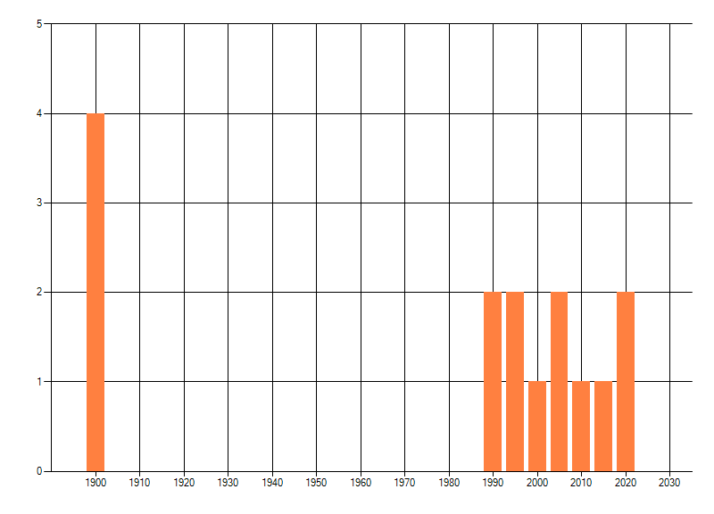 Het aantal atlasblokken (5x5 km) waarin de soort is gemeld binnen een periode van vijf jaar (vanaf 1980) of twintig jaar. Niet gecorrigeerd voor waarnemersinspanning en het aantal doorgegeven waarnemingen kan sterk variëren per periode, dus een trend in verspreiding kan hier niet direct uit worden afgelezen. Het opgegeven jaartal is het eerste jaar van de periode. Bron: gevalideerde waarnemingen uit de NDFF.