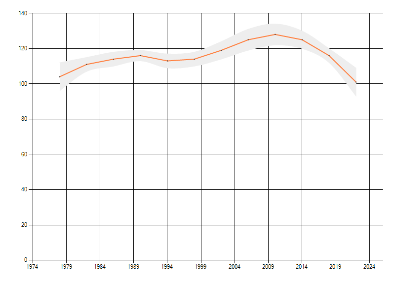 Gemiddelde trend van het aantal kilometerhokken waarin de soort voorkomt, weergegeven als indexcijfer (1975-1978 = 100).