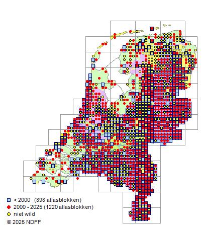 CC BY-NC-SA 3.0 NLVerspreidingNederlandVrij algemeen in Zuid-Limburg, in het oosten en midden van het land, in het rivieregebied en in de Hollandse en Zeeuwse duinen en zeldzaam in laagveengebieden. Elders zeer zeldzaam.