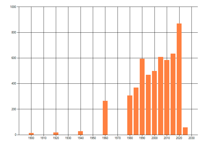 Het aantal atlasblokken (5x5 km) waarin de soort is gemeld binnen een periode van vijf jaar (vanaf 1980) of twintig jaar. Niet gecorrigeerd voor waarnemersinspanning en het aantal doorgegeven waarnemingen kan sterk variëren per periode, dus een trend in verspreiding kan hier niet direct uit worden afgelezen. Het opgegeven jaartal is het eerste jaar van de periode. Bron: gevalideerde waarnemingen uit de NDFF.