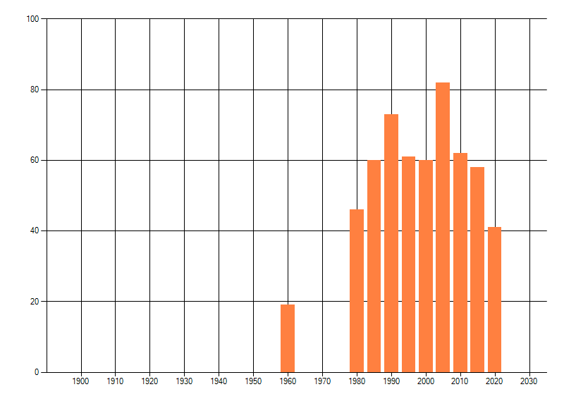 Het aantal atlasblokken (5x5 km) waarin de soort is gemeld binnen een periode van vijf jaar (vanaf 1980) of twintig jaar. Niet gecorrigeerd voor waarnemersinspanning en het aantal doorgegeven waarnemingen kan sterk variëren per periode, dus een trend in verspreiding kan hier niet direct uit worden afgelezen. Het opgegeven jaartal is het eerste jaar van de periode. Bron: gevalideerde waarnemingen uit de NDFF.