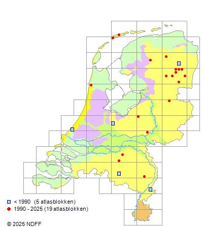 Het aantal atlasblokken (5x5 km) waarin de soort is gemeld binnen een periode van vijf jaar (vanaf 1980) of twintig jaar. Niet gecorrigeerd voor waarnemersinspanning en het aantal doorgegeven waarnemingen kan sterk variëren per periode, dus een trend in verspreiding kan hier niet direct uit worden afgelezen. Het opgegeven jaartal is het eerste jaar van de periode. Bron: gevalideerde waarnemingen uit de NDFF.