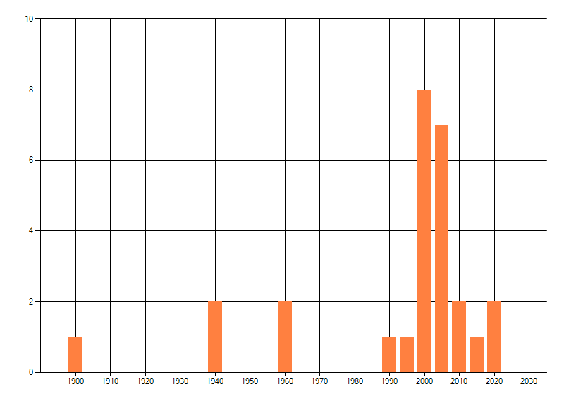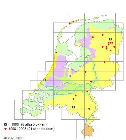 Het aantal atlasblokken (5x5 km) waarin de soort is gemeld binnen een periode van vijf jaar (vanaf 1980) of twintig jaar. Niet gecorrigeerd voor waarnemersinspanning en het aantal doorgegeven waarnemingen kan sterk variëren per periode, dus een trend in verspreiding kan hier niet direct uit worden afgelezen. Het opgegeven jaartal is het eerste jaar van de periode. Bron: gevalideerde waarnemingen uit de NDFF.