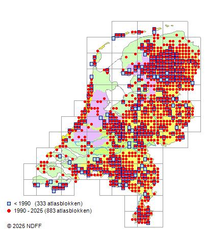 Het aantal atlasblokken (5x5 km) waarin de soort is gemeld binnen een periode van vijf jaar (vanaf 1980) of twintig jaar. Niet gecorrigeerd voor waarnemersinspanning en het aantal doorgegeven waarnemingen kan sterk variëren per periode, dus een trend in verspreiding kan hier niet direct uit worden afgelezen. Het opgegeven jaartal is het eerste jaar van de periode. Bron: gevalideerde waarnemingen uit de NDFF.