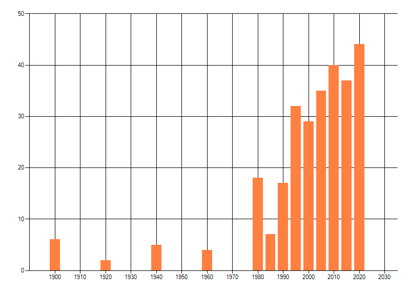 Het aantal atlasblokken (5x5 km) waarin de soort is gemeld binnen een periode van vijf jaar (vanaf 1980) of twintig jaar. Niet gecorrigeerd voor waarnemersinspanning en het aantal doorgegeven waarnemingen kan sterk variëren per periode, dus een trend in verspreiding kan hier niet direct uit worden afgelezen. Het opgegeven jaartal is het eerste jaar van de periode. Bron: gevalideerde waarnemingen uit de NDFF.