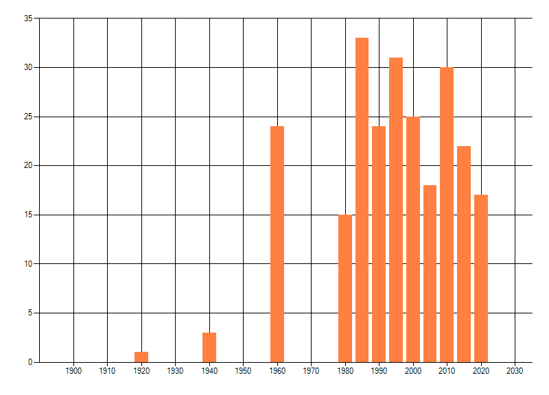 Het aantal atlasblokken (5x5 km) waarin de soort is gemeld binnen een periode van vijf jaar (vanaf 1980) of twintig jaar. Niet gecorrigeerd voor waarnemersinspanning en het aantal doorgegeven waarnemingen kan sterk variëren per periode, dus een trend in verspreiding kan hier niet direct uit worden afgelezen. Het opgegeven jaartal is het eerste jaar van de periode. Bron: gevalideerde waarnemingen uit de NDFF.