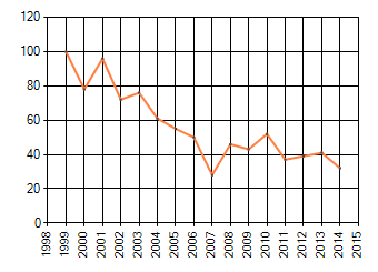 Trend in het geschatte aantal individuen van paddenstoelen in bossen op de hoge zandgronden, weergegeven als indexcijfer (eerste jaar = 100). Bron: