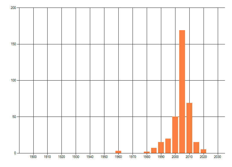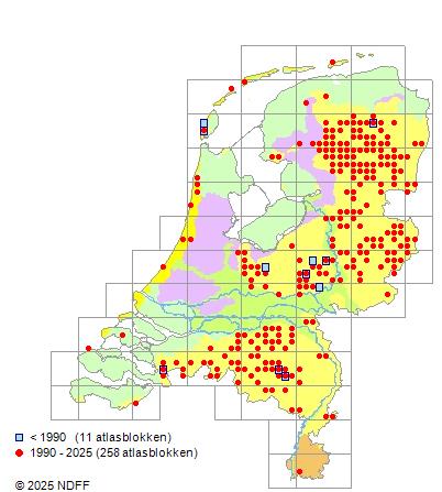 Het aantal atlasblokken (5x5 km) waarin de soort is gemeld binnen een periode van vijf jaar (vanaf 1980) of twintig jaar. Niet gecorrigeerd voor waarnemersinspanning en het aantal doorgegeven waarnemingen kan sterk variëren per periode, dus een trend in verspreiding kan hier niet direct uit worden afgelezen. Het opgegeven jaartal is het eerste jaar van de periode. Bron: gevalideerde waarnemingen uit de NDFF.
