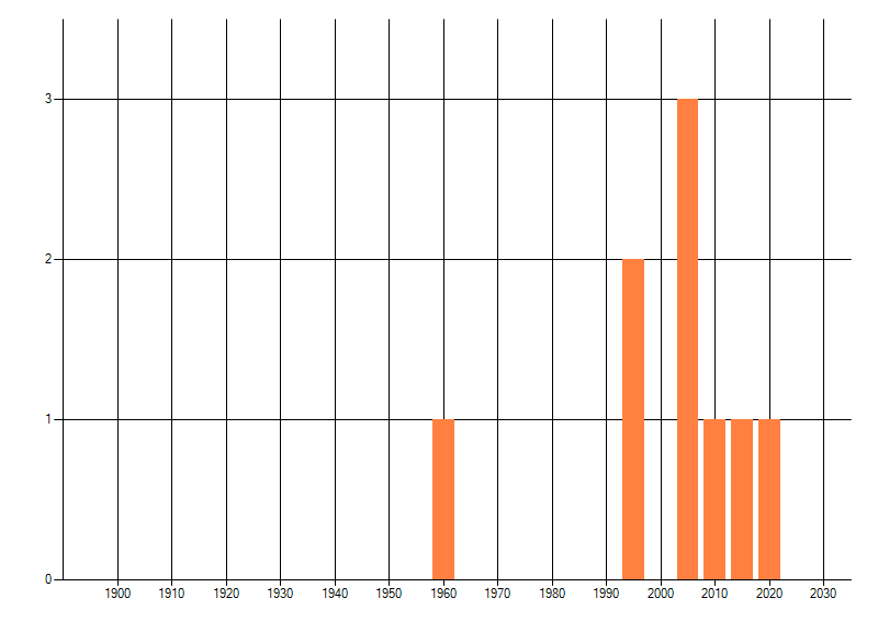 Het aantal atlasblokken (5x5 km) waarin de soort is gemeld binnen een periode van vijf jaar (vanaf 1980) of twintig jaar. Niet gecorrigeerd voor waarnemersinspanning en het aantal doorgegeven waarnemingen kan sterk variëren per periode, dus een trend in verspreiding kan hier niet direct uit worden afgelezen. Het opgegeven jaartal is het eerste jaar van de periode. Bron: gevalideerde waarnemingen uit de NDFF.