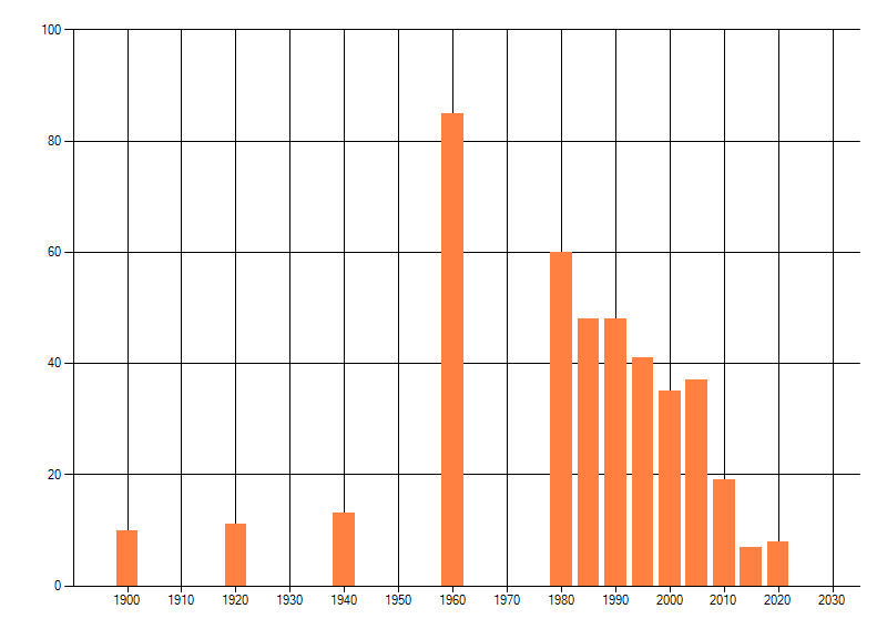 Het aantal atlasblokken (5x5 km) waarin de soort is gemeld binnen een periode van vijf jaar (vanaf 1980) of twintig jaar. Niet gecorrigeerd voor waarnemersinspanning en het aantal doorgegeven waarnemingen kan sterk variëren per periode, dus een trend in verspreiding kan hier niet direct uit worden afgelezen. Het opgegeven jaartal is het eerste jaar van de periode. Bron: gevalideerde waarnemingen uit de NDFF.