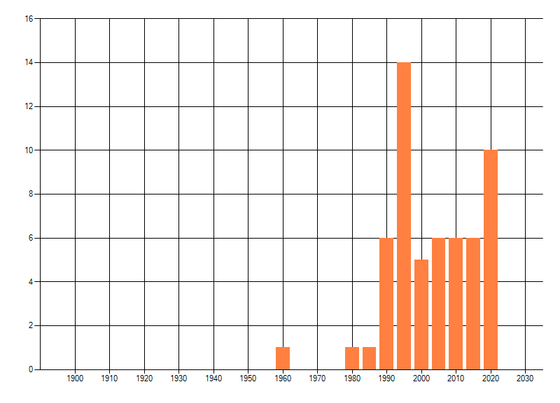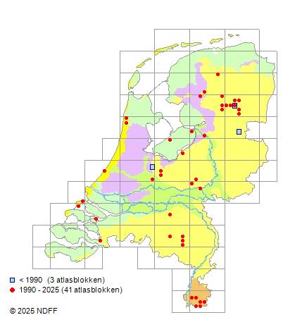 Het aantal atlasblokken (5x5 km) waarin de soort is gemeld binnen een periode van vijf jaar (vanaf 1980) of twintig jaar. Niet gecorrigeerd voor waarnemersinspanning en het aantal doorgegeven waarnemingen kan sterk variëren per periode, dus een trend in verspreiding kan hier niet direct uit worden afgelezen. Het opgegeven jaartal is het eerste jaar van de periode. Bron: gevalideerde waarnemingen uit de NDFF.