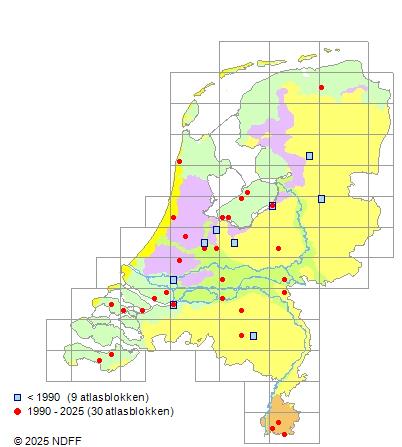 Het aantal atlasblokken (5x5 km) waarin de soort is gemeld binnen een periode van vijf jaar (vanaf 1980) of twintig jaar. Niet gecorrigeerd voor waarnemersinspanning en het aantal doorgegeven waarnemingen kan sterk variëren per periode, dus een trend in verspreiding kan hier niet direct uit worden afgelezen. Het opgegeven jaartal is het eerste jaar van de periode. Bron: gevalideerde waarnemingen uit de NDFF.