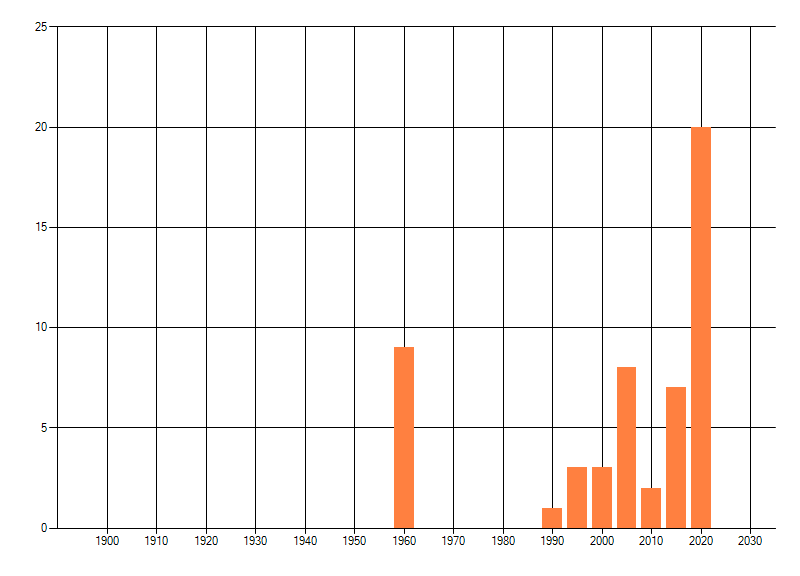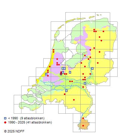 Het aantal atlasblokken (5x5 km) waarin de soort is gemeld binnen een periode van vijf jaar (vanaf 1980) of twintig jaar. Niet gecorrigeerd voor waarnemersinspanning en het aantal doorgegeven waarnemingen kan sterk variëren per periode, dus een trend in verspreiding kan hier niet direct uit worden afgelezen. Het opgegeven jaartal is het eerste jaar van de periode. Bron: gevalideerde waarnemingen uit de NDFF.