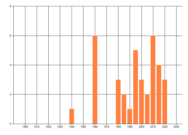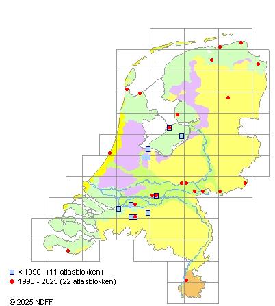 Het aantal atlasblokken (5x5 km) waarin de soort is gemeld binnen een periode van vijf jaar (vanaf 1980) of twintig jaar. Niet gecorrigeerd voor waarnemersinspanning en het aantal doorgegeven waarnemingen kan sterk variëren per periode, dus een trend in verspreiding kan hier niet direct uit worden afgelezen. Het opgegeven jaartal is het eerste jaar van de periode. Bron: gevalideerde waarnemingen uit de NDFF.