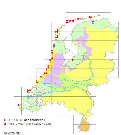 Het aantal atlasblokken (5x5 km) waarin de soort is gemeld binnen een periode van vijf jaar (vanaf 1980) of twintig jaar. Niet gecorrigeerd voor waarnemersinspanning en het aantal doorgegeven waarnemingen kan sterk variëren per periode, dus een trend in verspreiding kan hier niet direct uit worden afgelezen. Het opgegeven jaartal is het eerste jaar van de periode. Bron: gevalideerde waarnemingen uit de NDFF.