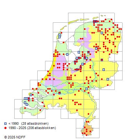 Het aantal atlasblokken (5x5 km) waarin de soort is gemeld binnen een periode van vijf jaar (vanaf 1980) of twintig jaar. Niet gecorrigeerd voor waarnemersinspanning en het aantal doorgegeven waarnemingen kan sterk variëren per periode, dus een trend in verspreiding kan hier niet direct uit worden afgelezen. Het opgegeven jaartal is het eerste jaar van de periode. Bron: gevalideerde waarnemingen uit de NDFF.