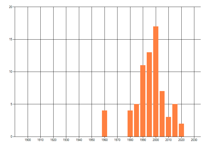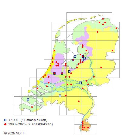 Het aantal atlasblokken (5x5 km) waarin de soort is gemeld binnen een periode van vijf jaar (vanaf 1980) of twintig jaar. Niet gecorrigeerd voor waarnemersinspanning en het aantal doorgegeven waarnemingen kan sterk variëren per periode, dus een trend in verspreiding kan hier niet direct uit worden afgelezen. Het opgegeven jaartal is het eerste jaar van de periode. Bron: gevalideerde waarnemingen uit de NDFF.