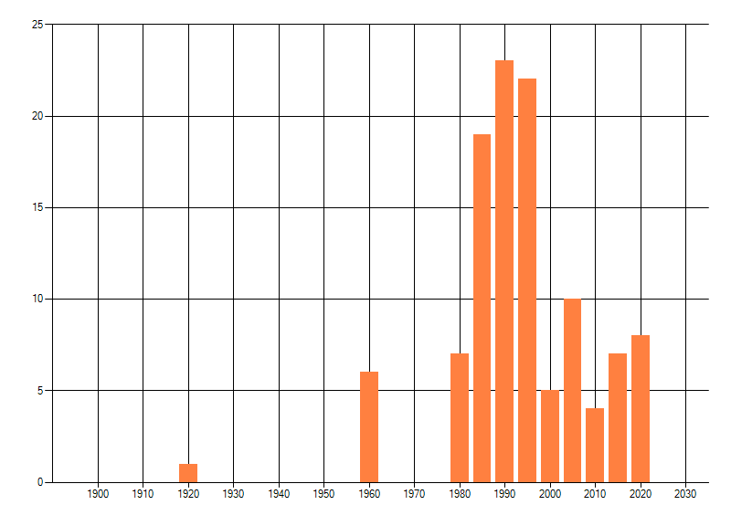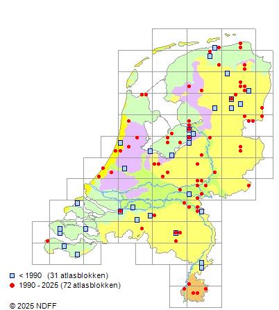 Het aantal atlasblokken (5x5 km) waarin de soort is gemeld binnen een periode van vijf jaar (vanaf 1980) of twintig jaar. Niet gecorrigeerd voor waarnemersinspanning en het aantal doorgegeven waarnemingen kan sterk variëren per periode, dus een trend in verspreiding kan hier niet direct uit worden afgelezen. Het opgegeven jaartal is het eerste jaar van de periode. Bron: gevalideerde waarnemingen uit de NDFF.