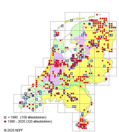 Het aantal atlasblokken (5x5 km) waarin de soort is gemeld binnen een periode van vijf jaar (vanaf 1980) of twintig jaar. Niet gecorrigeerd voor waarnemersinspanning en het aantal doorgegeven waarnemingen kan sterk variëren per periode, dus een trend in verspreiding kan hier niet direct uit worden afgelezen. Het opgegeven jaartal is het eerste jaar van de periode. Bron: gevalideerde waarnemingen uit de NDFF.