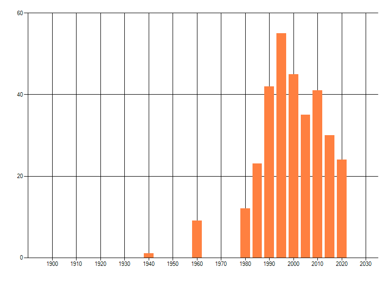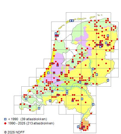 Het aantal atlasblokken (5x5 km) waarin de soort is gemeld binnen een periode van vijf jaar (vanaf 1980) of twintig jaar. Niet gecorrigeerd voor waarnemersinspanning en het aantal doorgegeven waarnemingen kan sterk variëren per periode, dus een trend in verspreiding kan hier niet direct uit worden afgelezen. Het opgegeven jaartal is het eerste jaar van de periode. Bron: gevalideerde waarnemingen uit de NDFF.