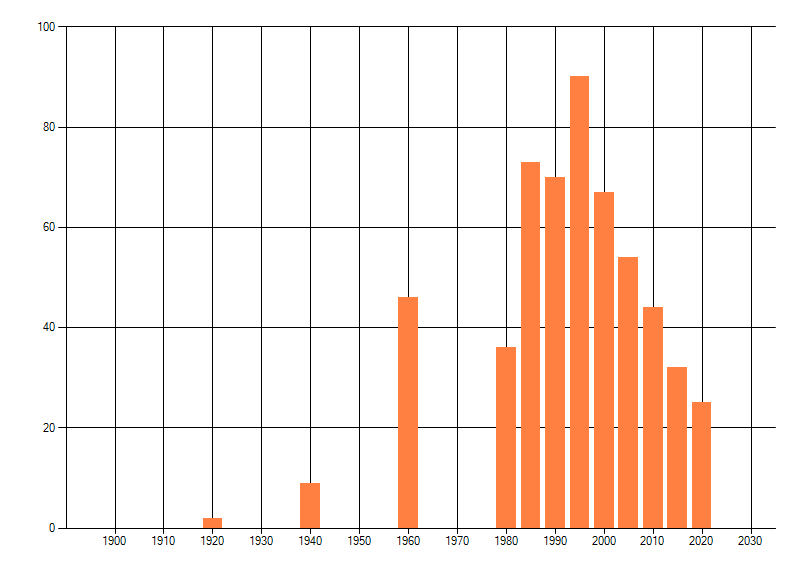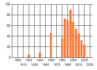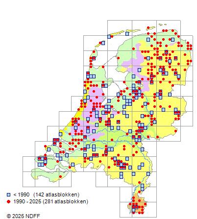 Het aantal atlasblokken (5x5 km) waarin de soort is gemeld binnen een periode van vijf jaar (vanaf 1980) of twintig jaar. Niet gecorrigeerd voor waarnemersinspanning en het aantal doorgegeven waarnemingen kan sterk variëren per periode, dus een trend in verspreiding kan hier niet direct uit worden afgelezen. Het opgegeven jaartal is het eerste jaar van de periode. Bron: gevalideerde waarnemingen uit de NDFF.