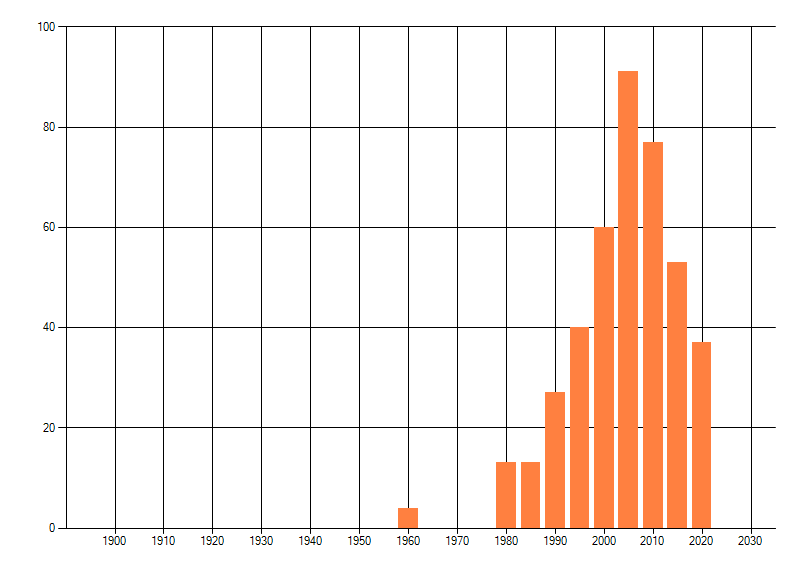 Het aantal atlasblokken (5x5 km) waarin de soort is gemeld binnen een periode van vijf jaar (vanaf 1980) of twintig jaar. Niet gecorrigeerd voor waarnemersinspanning en het aantal doorgegeven waarnemingen kan sterk variëren per periode, dus een trend in verspreiding kan hier niet direct uit worden afgelezen. Het opgegeven jaartal is het eerste jaar van de periode. Bron: gevalideerde waarnemingen uit de NDFF.