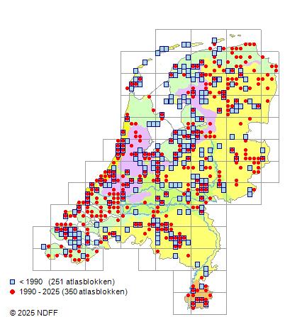 Het aantal atlasblokken (5x5 km) waarin de soort is gemeld binnen een periode van vijf jaar (vanaf 1980) of twintig jaar. Niet gecorrigeerd voor waarnemersinspanning en het aantal doorgegeven waarnemingen kan sterk variëren per periode, dus een trend in verspreiding kan hier niet direct uit worden afgelezen. Het opgegeven jaartal is het eerste jaar van de periode. Bron: gevalideerde waarnemingen uit de NDFF.