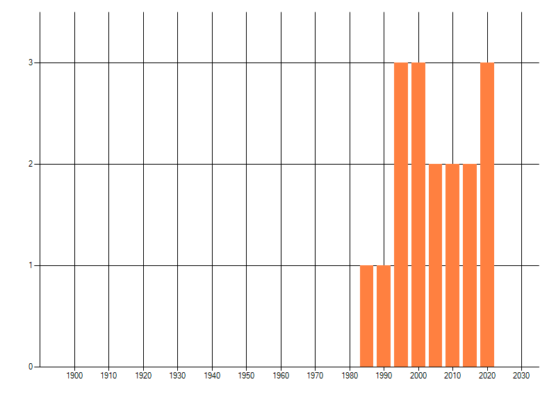 Het aantal atlasblokken (5x5 km) waarin de soort is gemeld binnen een periode van vijf jaar (vanaf 1980) of twintig jaar. Niet gecorrigeerd voor waarnemersinspanning en het aantal doorgegeven waarnemingen kan sterk variëren per periode, dus een trend in verspreiding kan hier niet direct uit worden afgelezen. Het opgegeven jaartal is het eerste jaar van de periode. Bron: gevalideerde waarnemingen uit de NDFF.