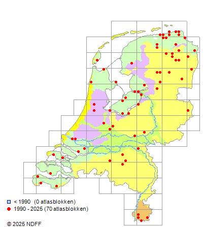 Het aantal atlasblokken (5x5 km) waarin de soort is gemeld binnen een periode van vijf jaar (vanaf 1980) of twintig jaar. Niet gecorrigeerd voor waarnemersinspanning en het aantal doorgegeven waarnemingen kan sterk variëren per periode, dus een trend in verspreiding kan hier niet direct uit worden afgelezen. Het opgegeven jaartal is het eerste jaar van de periode. Bron: gevalideerde waarnemingen uit de NDFF.