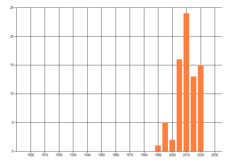 Het aantal atlasblokken (5x5 km) waarin de soort is gemeld binnen een periode van vijf jaar (vanaf 1980) of twintig jaar. Niet gecorrigeerd voor waarnemersinspanning en het aantal doorgegeven waarnemingen kan sterk variëren per periode, dus een trend in verspreiding kan hier niet direct uit worden afgelezen. Het opgegeven jaartal is het eerste jaar van de periode. Bron: gevalideerde waarnemingen uit de NDFF.