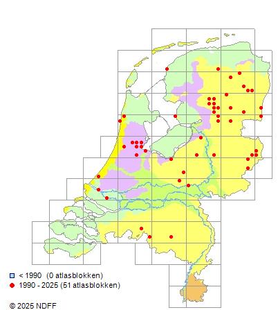 Het aantal atlasblokken (5x5 km) waarin de soort is gemeld binnen een periode van vijf jaar (vanaf 1980) of twintig jaar. Niet gecorrigeerd voor waarnemersinspanning en het aantal doorgegeven waarnemingen kan sterk variëren per periode, dus een trend in verspreiding kan hier niet direct uit worden afgelezen. Het opgegeven jaartal is het eerste jaar van de periode. Bron: gevalideerde waarnemingen uit de NDFF.