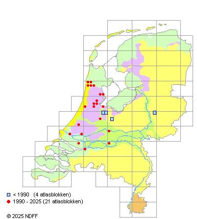 Het aantal atlasblokken (5x5 km) waarin de soort is gemeld binnen een periode van vijf jaar (vanaf 1980) of twintig jaar. Niet gecorrigeerd voor waarnemersinspanning en het aantal doorgegeven waarnemingen kan sterk variëren per periode, dus een trend in verspreiding kan hier niet direct uit worden afgelezen. Het opgegeven jaartal is het eerste jaar van de periode. Bron: gevalideerde waarnemingen uit de NDFF.
