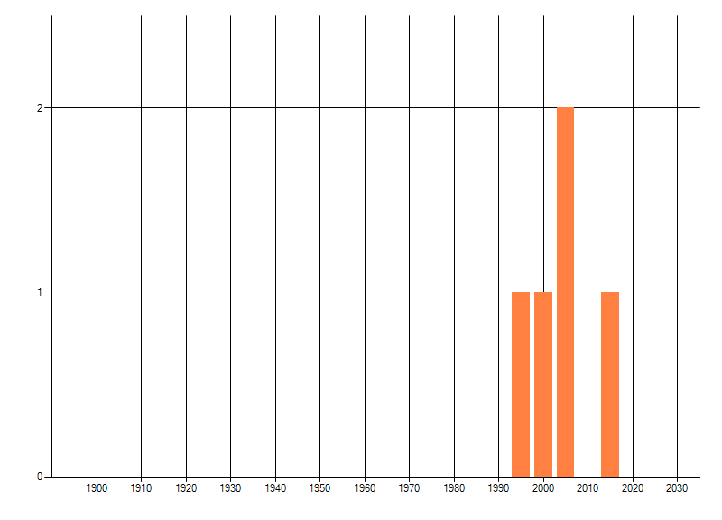 Het aantal atlasblokken (5x5 km) waarin de soort is gemeld binnen een periode van vijf jaar (vanaf 1980) of twintig jaar. Niet gecorrigeerd voor waarnemersinspanning en het aantal doorgegeven waarnemingen kan sterk variëren per periode, dus een trend in verspreiding kan hier niet direct uit worden afgelezen. Het opgegeven jaartal is het eerste jaar van de periode. Bron: gevalideerde waarnemingen uit de NDFF.