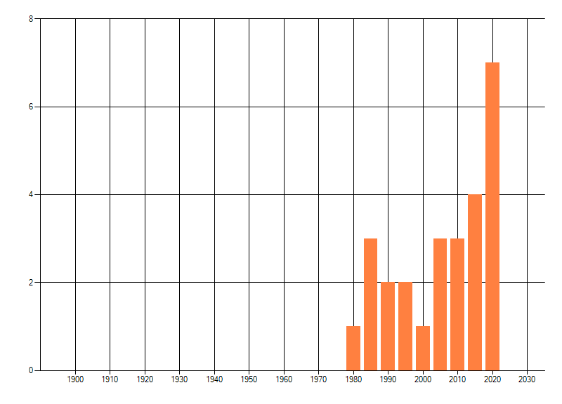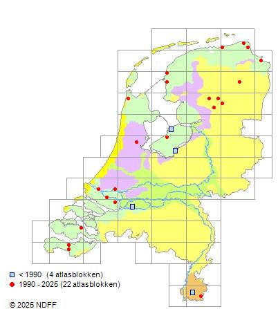 Het aantal atlasblokken (5x5 km) waarin de soort is gemeld binnen een periode van vijf jaar (vanaf 1980) of twintig jaar. Niet gecorrigeerd voor waarnemersinspanning en het aantal doorgegeven waarnemingen kan sterk variëren per periode, dus een trend in verspreiding kan hier niet direct uit worden afgelezen. Het opgegeven jaartal is het eerste jaar van de periode. Bron: gevalideerde waarnemingen uit de NDFF.