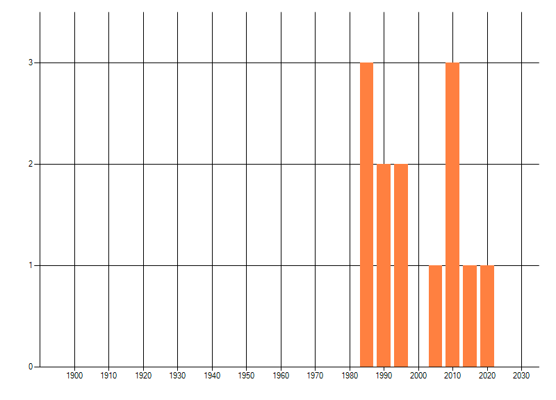 Het aantal atlasblokken (5x5 km) waarin de soort is gemeld binnen een periode van vijf jaar (vanaf 1980) of twintig jaar. Niet gecorrigeerd voor waarnemersinspanning en het aantal doorgegeven waarnemingen kan sterk variëren per periode, dus een trend in verspreiding kan hier niet direct uit worden afgelezen. Het opgegeven jaartal is het eerste jaar van de periode. Bron: gevalideerde waarnemingen uit de NDFF.