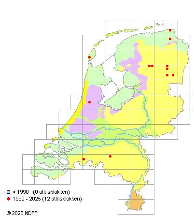 Het aantal atlasblokken (5x5 km) waarin de soort is gemeld binnen een periode van vijf jaar (vanaf 1980) of twintig jaar. Niet gecorrigeerd voor waarnemersinspanning en het aantal doorgegeven waarnemingen kan sterk variëren per periode, dus een trend in verspreiding kan hier niet direct uit worden afgelezen. Het opgegeven jaartal is het eerste jaar van de periode. Bron: gevalideerde waarnemingen uit de NDFF.