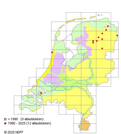 Het aantal atlasblokken (5x5 km) waarin de soort is gemeld binnen een periode van vijf jaar (vanaf 1980) of twintig jaar. Niet gecorrigeerd voor waarnemersinspanning en het aantal doorgegeven waarnemingen kan sterk variëren per periode, dus een trend in verspreiding kan hier niet direct uit worden afgelezen. Het opgegeven jaartal is het eerste jaar van de periode. Bron: gevalideerde waarnemingen uit de NDFF.