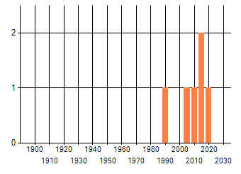 Het aantal atlasblokken (5x5 km) waarin de soort is gemeld binnen een periode van vijf jaar (vanaf 1980) of twintig jaar. Niet gecorrigeerd voor waarnemersinspanning en het aantal doorgegeven waarnemingen kan sterk variëren per periode, dus een trend in verspreiding kan hier niet direct uit worden afgelezen. Het opgegeven jaartal is het eerste jaar van de periode. Bron: gevalideerde waarnemingen uit de NDFF.